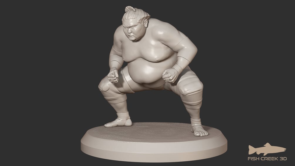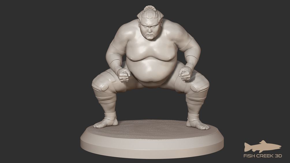 Sumo model in STL format for 3D printing. Supported and unsupported STL files of the model and pedestal are included. The STL file is sized to 35mm scale; for 28mm scale you should scale it down to 80% of the original size.